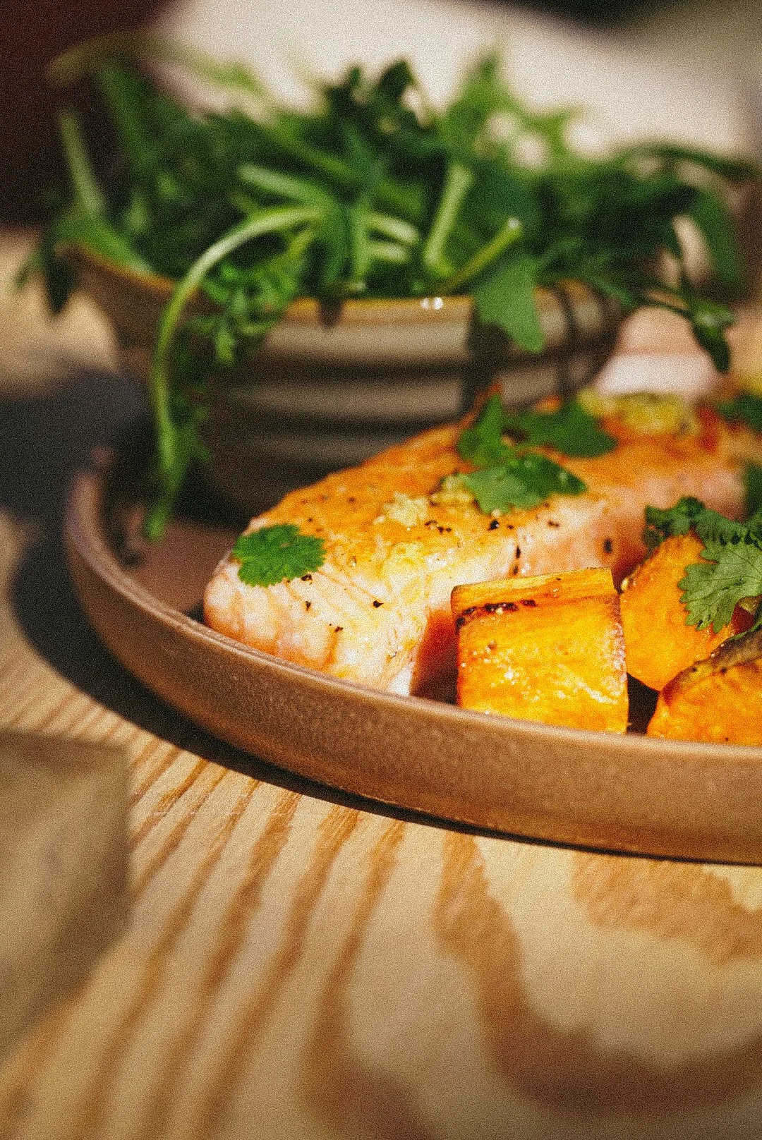 Salta och peppra fisken och stek den sedan den i en panna med olja tills den gyllenfärgad och precis genomstekt. Servera med sötpotatis och ringla dressingen på toppen i sällskap av färsk koriander. Hur gott som helst!