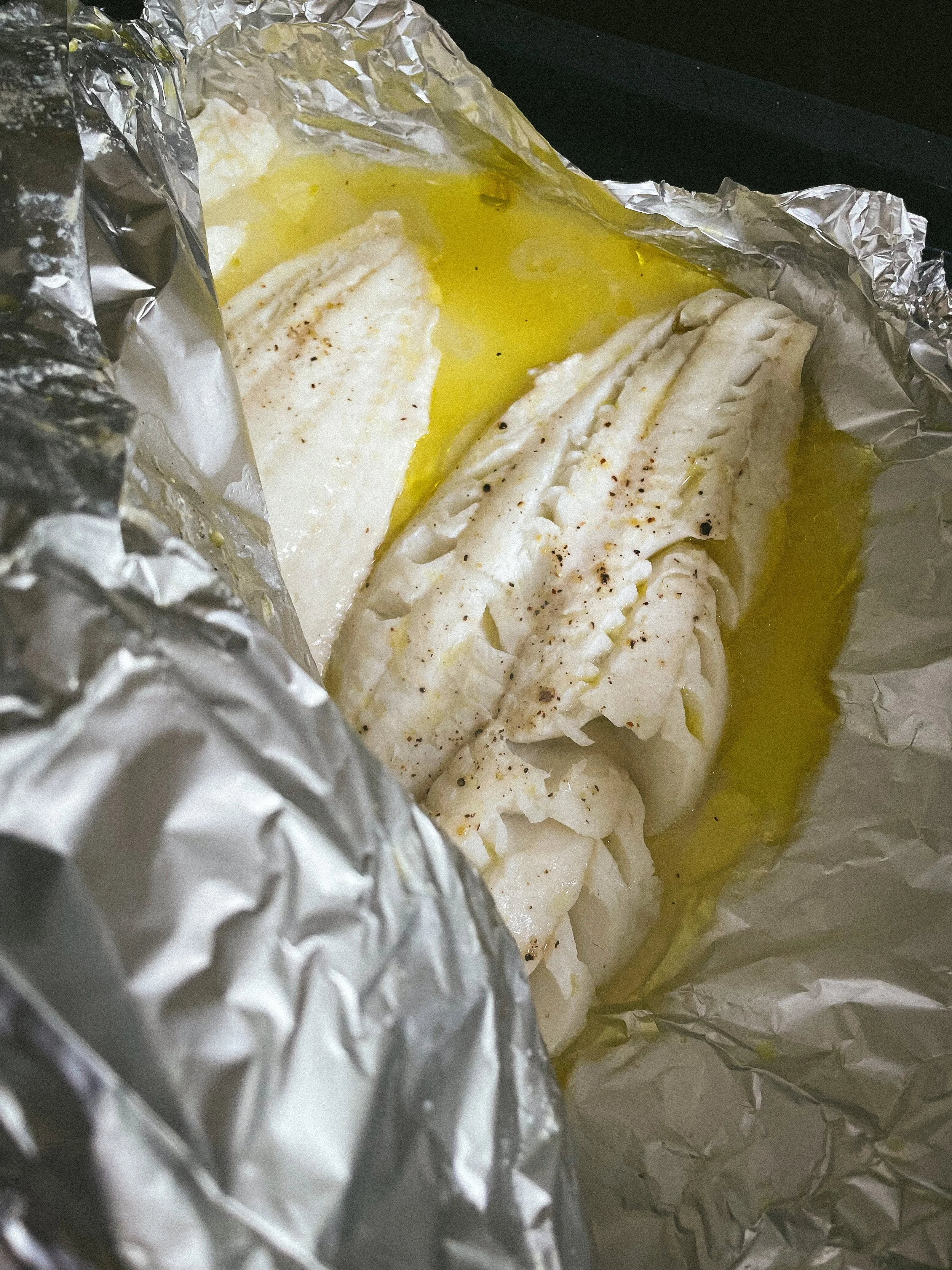 Sätt ugnen på 200 grader. Fräs den finhackade löken och sellerin i ghee i ca 5 minuter. Häll över vinet och reducera till hälften och tillsätt därefter buljongen och låt det puttra medans du rostar pinjenötterna i en torr panna. Ställ sedan pannan åt sidan. Ta fatt i torsken och lägg den på en aluminiumfolie som är stor nog att vikas dubbel över fisken. Pressa citronen över och salta och peppra. Gör ett paket av torsk och folien, in i ugnen i en kvart. Tillbaka till såsen som nu ska kryddas med salt, peppar, basilika och persilja.