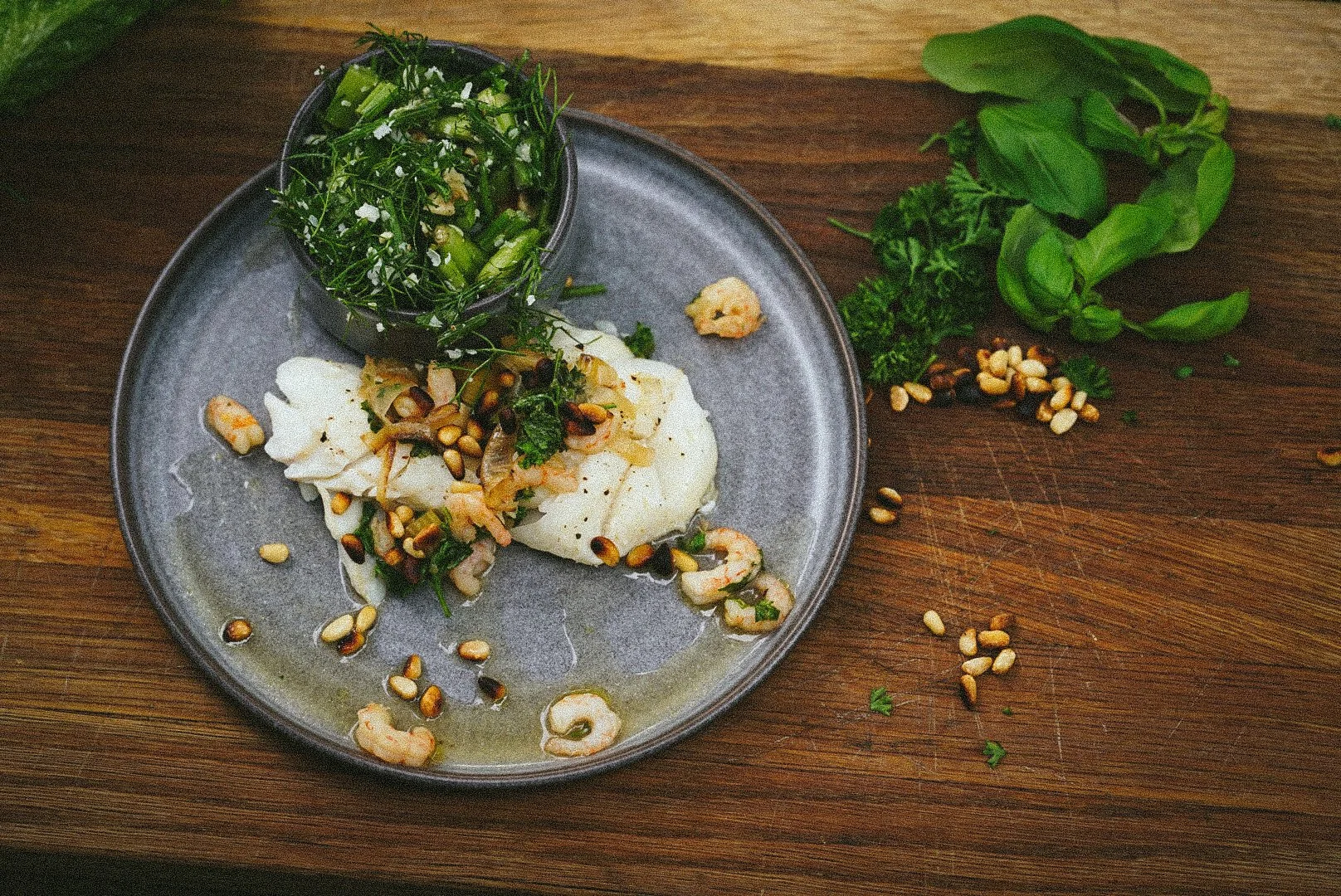 Servera fisken med såsen och toppa med räkor och pinjenötter.