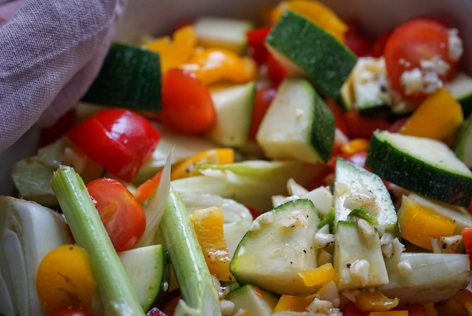 Sätt ugnen på 200 grader. Blanda olivolja, pressad vitlök, salt och peppar en stor skål. Halvera tomater och skär paprika, squash och fänkål i stora bitar. Svep runt grönsakerna i vitlöksoljan och lägg sedan grönsakerna i en ugnsfast form. Kör in det hela i ugnen i ca 20 minuter. Lägg därefter torsken i skålen med resterna av oljan och, vänd runt och lägg den sedan på grönsakerna och sätt in i ugnen ytterligare 10 minuter.