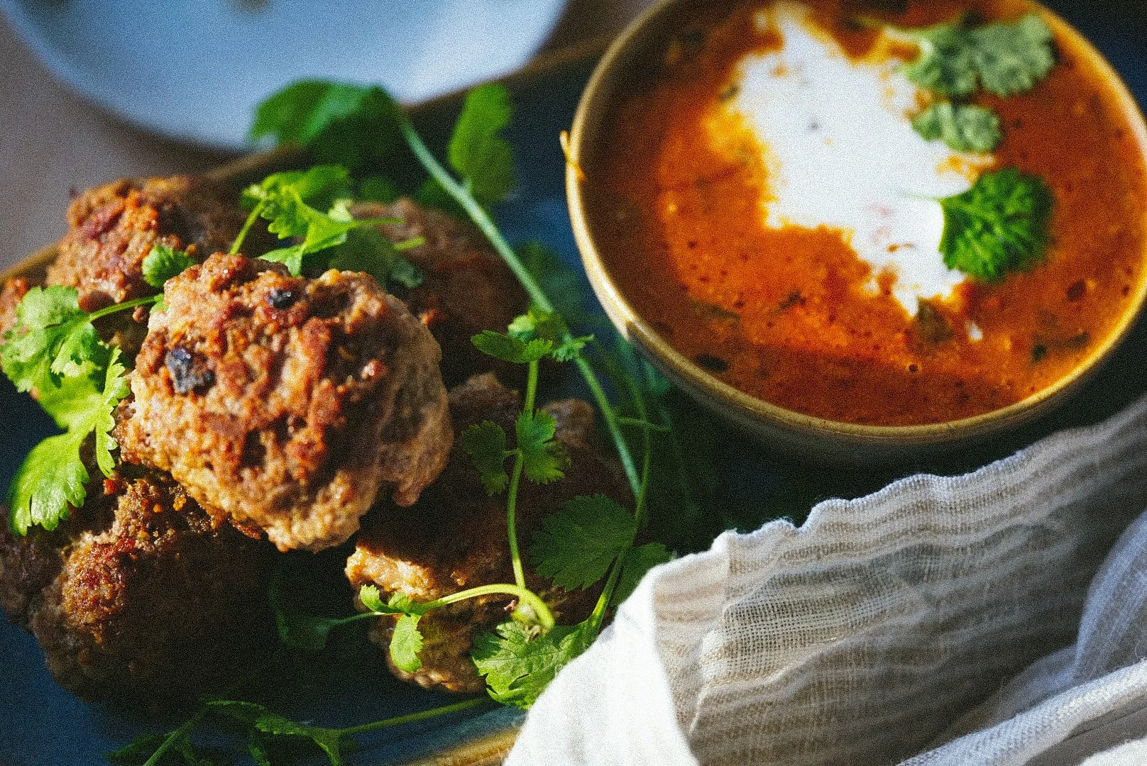 Nu är det dags för såsen. Fräs lök i 5 minuter och tillsätt därefter ingefära, vitlök, chili och korianderstjälkar och låt det fräsa i ytterligare ca 3 min. Tillsätt därefter resten av kryddblandningen och låt det fräsa med i ytterligare någon minut. I med vätskan dvs krossade tomater, tomatpuré, buljong och 1/3 av kokosgrädden. Låt härligheten puttra och resurs en kvart för att sedan låta såsen få sällskap genom att lägga ner köttbullarna i såsen och låta det puttra i ytterligare en kvart. Ringla över resten av kokosgrädden, strö över korianderbladen och servera. Förslagsvis tillsammans med blomkålsris.
