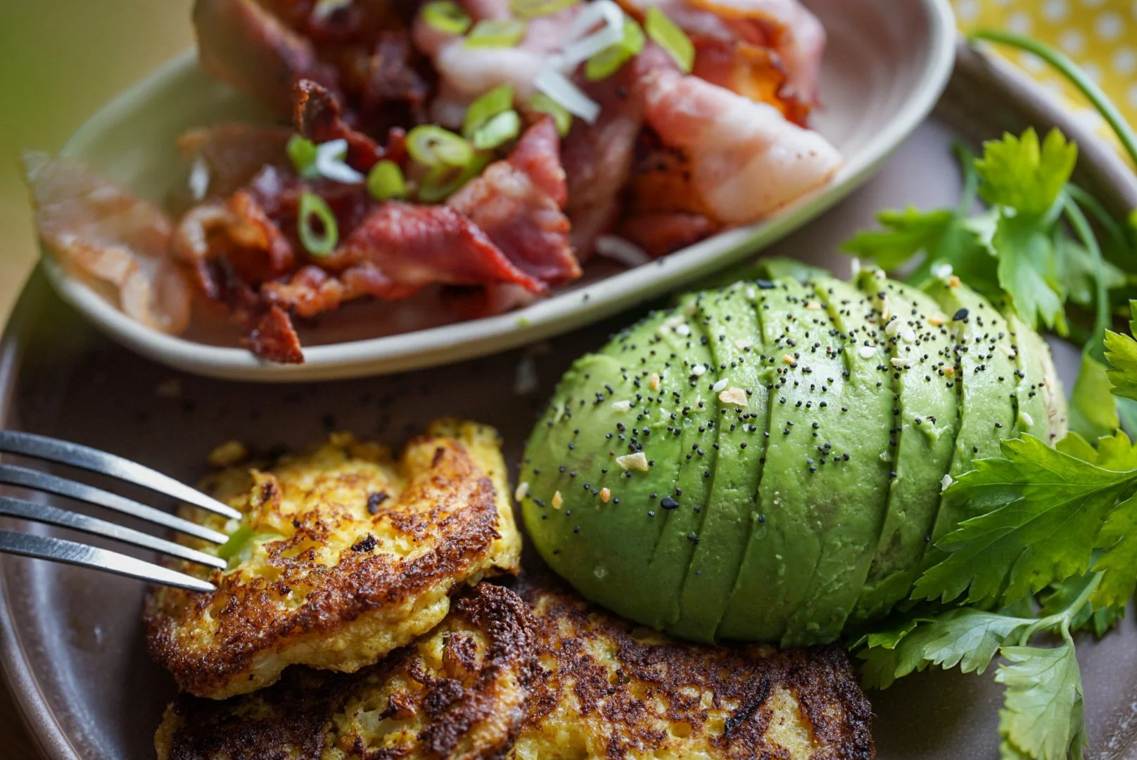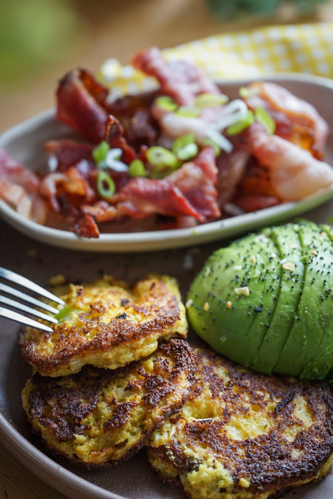 Kör blomkålen i en matberedare så att den blir ”finsmulig”. Blanda sedan blomkål och ägg i en stor bunke. Skär vårlöken fint och häll även ner det i smeten. (Spara gärna lite grann till pynt att strö påhoppen i sluttampen.) Värm en panna och smält ghee för att därefter skeda upp blomkålssmeten på medelhög värme. Låt de ligga några minuter innan du vänder dem för att ge de ytterligare några minuter.