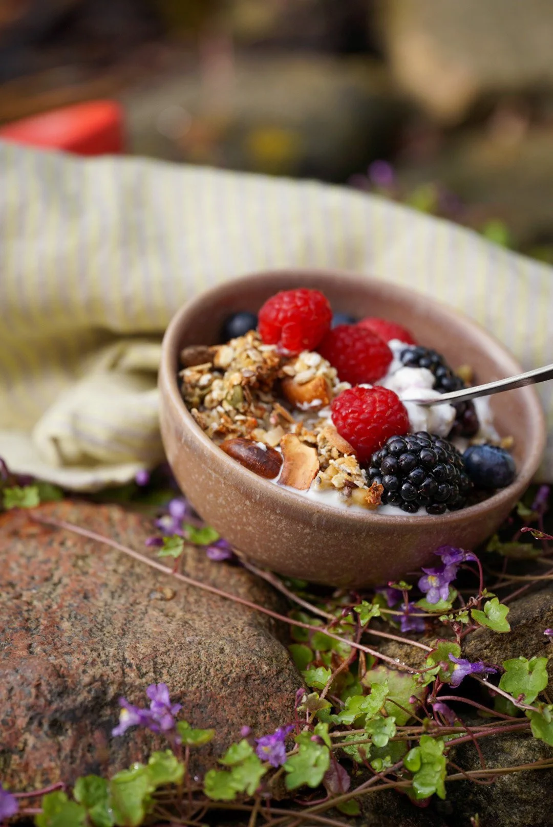 Sätt ugnen på 225 grader. Blanda samtliga ingredienser ordentligt i en skål och sprid sedan ut muslin på en ugnsplåt. In med plåten i ugnen och låt den stå inne i ca 30 minuter. Var 10e minut rör du om i plåten så att det inte blir fuktiga klumpar. Därefter sätter du ugnen på varmluft och sänker temperaturen till 50 grader och efter en kvart är muslin klar att avnjutas.