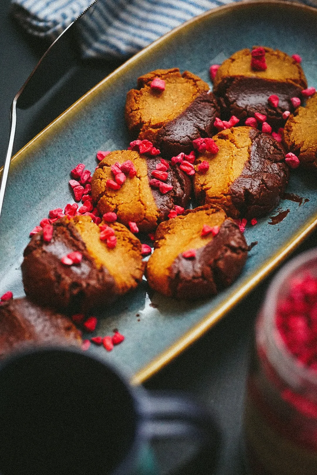Sätt ugnen på 160 grader och rör helt enkelt och snabbt ihop ingredienserna till degen. Forma degen till en rulle och skär den i 12 lika bitar. Rulla små kulor och lägg på en smord plåt och tryck sedan till alla kulorna med 2 fingrar så de blir lite platta och inte rullar iväg. In med plåten i ugnen och låt den bli där i en kvart.Låt sedan kakorna svalna samtidigt som du smälter choklad och kokosolja i en skål över vattenbad. Doppa kakor och låt chokladen stelna.