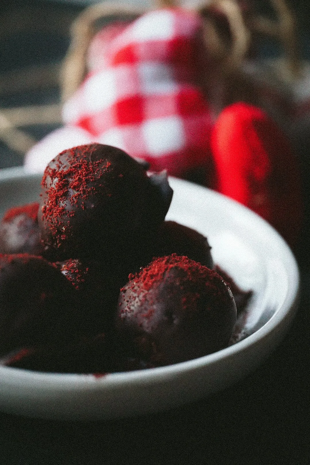 Börja med att riva ner choklad, dvs 3 1/2 dl i en glasskål och droppa sedan i mintextraktet. Därefter häller du kokosmjölk, kokossolja samt saltet i en gryta och låter den bli varm, inte het utan bara tills kokosoljan smält. Häll sedan vätskan över chokladen. Det är nu det är viktigt att chokladen är riven och finfördelad eftersom meningen är att chokladen ska smälta lätt trots att vätskan inte är het. Rör chokladmassan tills den blir slät, täck med bivaxduk eller någon form av lock och sätt i kylskåpet. Nu sätter du en timer på en kvart och när den ringer rör du runt i chokladmassan. Upprepa och sedan tar du 2 x 10 minutersintervall och sist 2 x 5 minutersintervall. På med locket och in i kylen imellan och rör ordentligt när klockan ringer. Efter denna ”behandling” är smeten kall och möjlig att rulla till lagom teskedsstora stora kulor. Därefter placerar du kulorna på ett fat och sätter in de i kylen igen för att hålla dem så kalla som möjligt för de sista momenten. Smält den sista chokladen över ett vattenbad och rör sedan runt till chokladen svalnat så den är på ca 32 grader. Personligen mäter jag inte utan jag känner att den har svalnat. Ta sedan och doppa och se till att kulorna blir täckta av choklad, lägg på bakplåtspappret och precis innan chokladen stelnad pudrar du över lingonpulvret. Klart!