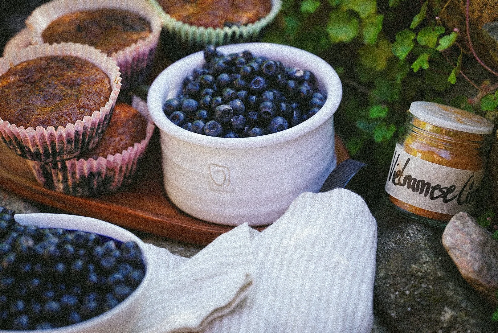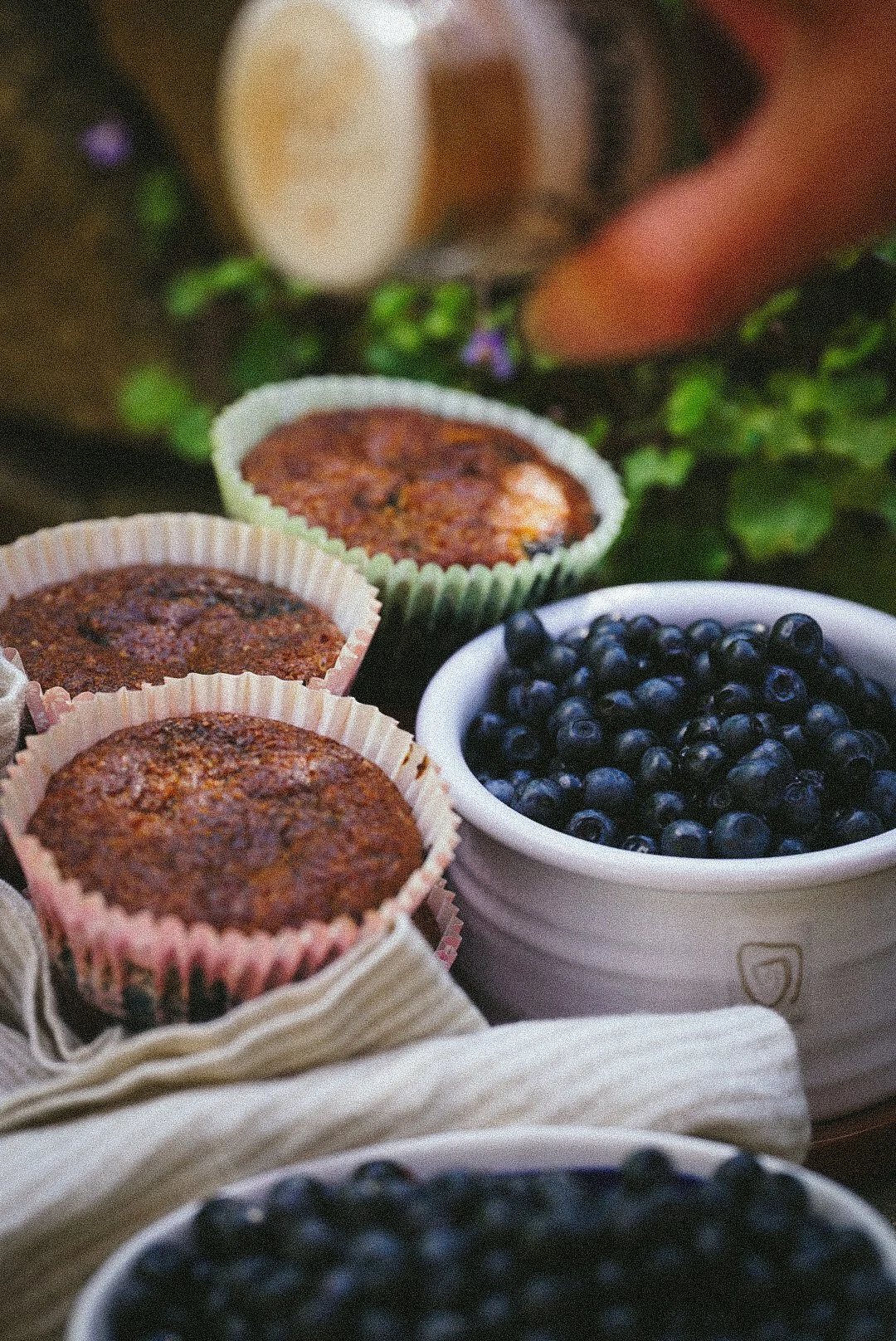 Sätt ugnen på 180 grader och rör ihop smeten och blanda ordentligt. Till sist vänder du försiktigt ner blåbär och häller ner i muffinsformar. Baka mitt i ugnen i ca 20 minuter.