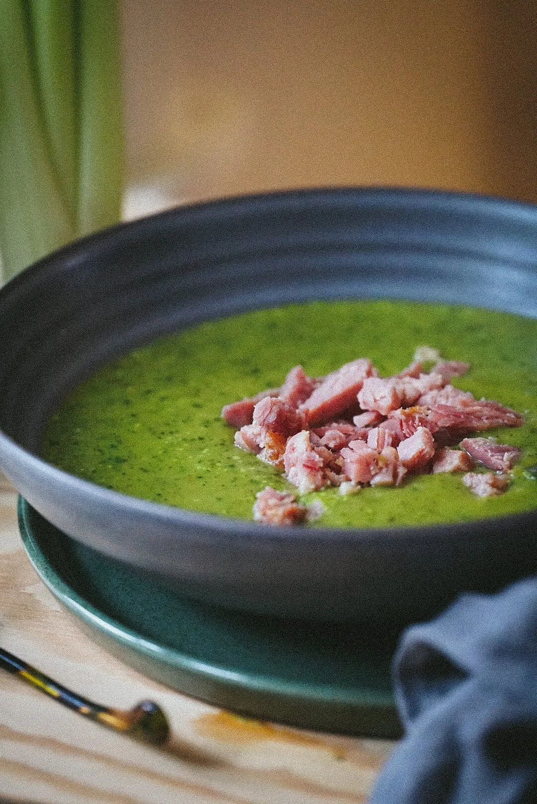 Skär grönsakerna och hacka löken för att sedan fräsa det hela snabbt i en gryta med ghee i botten på en kastrull. Salta och peppra. Skiva skinkan och lägg den ovanpå grönsakerna i grytan. Lägg på ett lock och sänk värmen. Låt grytan stå och puttra på svag värme i ca 45 min. Det blir mycket vätska av grönsakerna och skinkan bidrar till en ljuvlig buljong bara man inte glömmer att sätta på locket. Lyft upp skinkan och skär den i småbitar. Ett annat sätt är att ta en gaffel och riva den. så den blir så finfördelad som möjligt. Lyft även upp lagerbladet ur grytan. Nu är det dags att hälla i kokosgrädden och ev lite mer vatten om så önskas. Därefter mixar du soppan slät med en mixerstav. Servera den sedan md skinkströsslet på toppen.