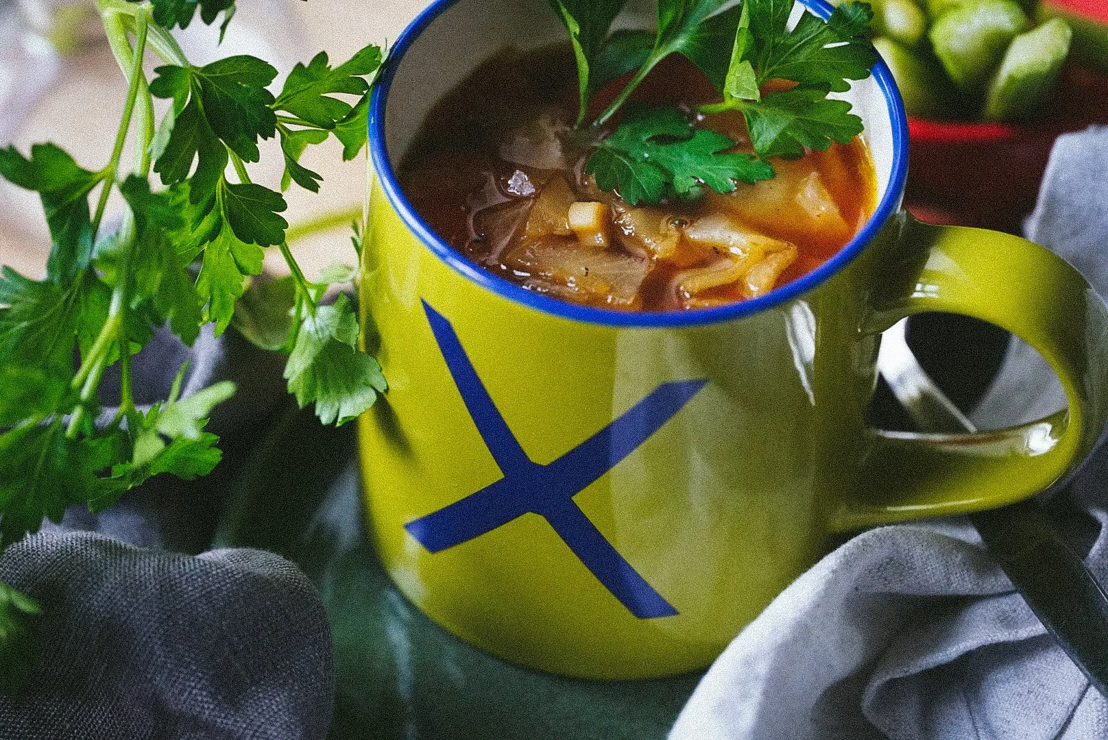 Strimla och fräs kål, lök, morot och vitlök i en stor gryta tills allt fått lite färg. Under tiden laddar du en tekula med lagerblad, krydd- och vitpeppar. Lägg silen/kulan i grytan och häll sedan över buljongen. Koka upp och sänk därefter värmen och låt soppan pluddra i en halvtimme. Salta efter behag och servera med hackad persilja på toppen.